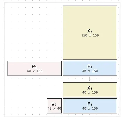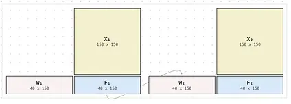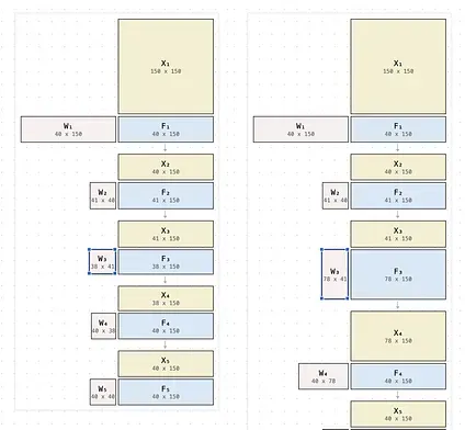 The same visual logic applies in the other direction. Stacking layers horizontally means multiplying on the right. The output F₁ feeds across to become W₂ for the next layer, giving F₂ = (W₁X₁)X₂.