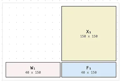 Look at what happens. The right edge of W lines up with the bottom edge of X. That alignment is the inner dimension — the one that has to match for the multiplication to be valid. And the result F = WX simply fills in the remaining rectangle below X and to the right of W. It takes its height from W and its width from X.