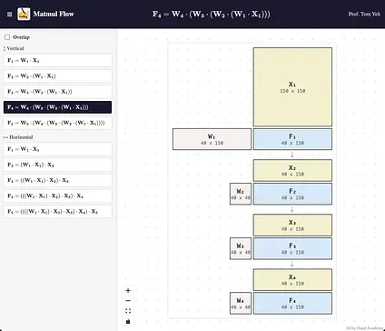 Section titled “AI by Hand ✍️ Academy”I built a new interactive tool called MatmulFlow to visualize the dimensions of matrix multiplications.
