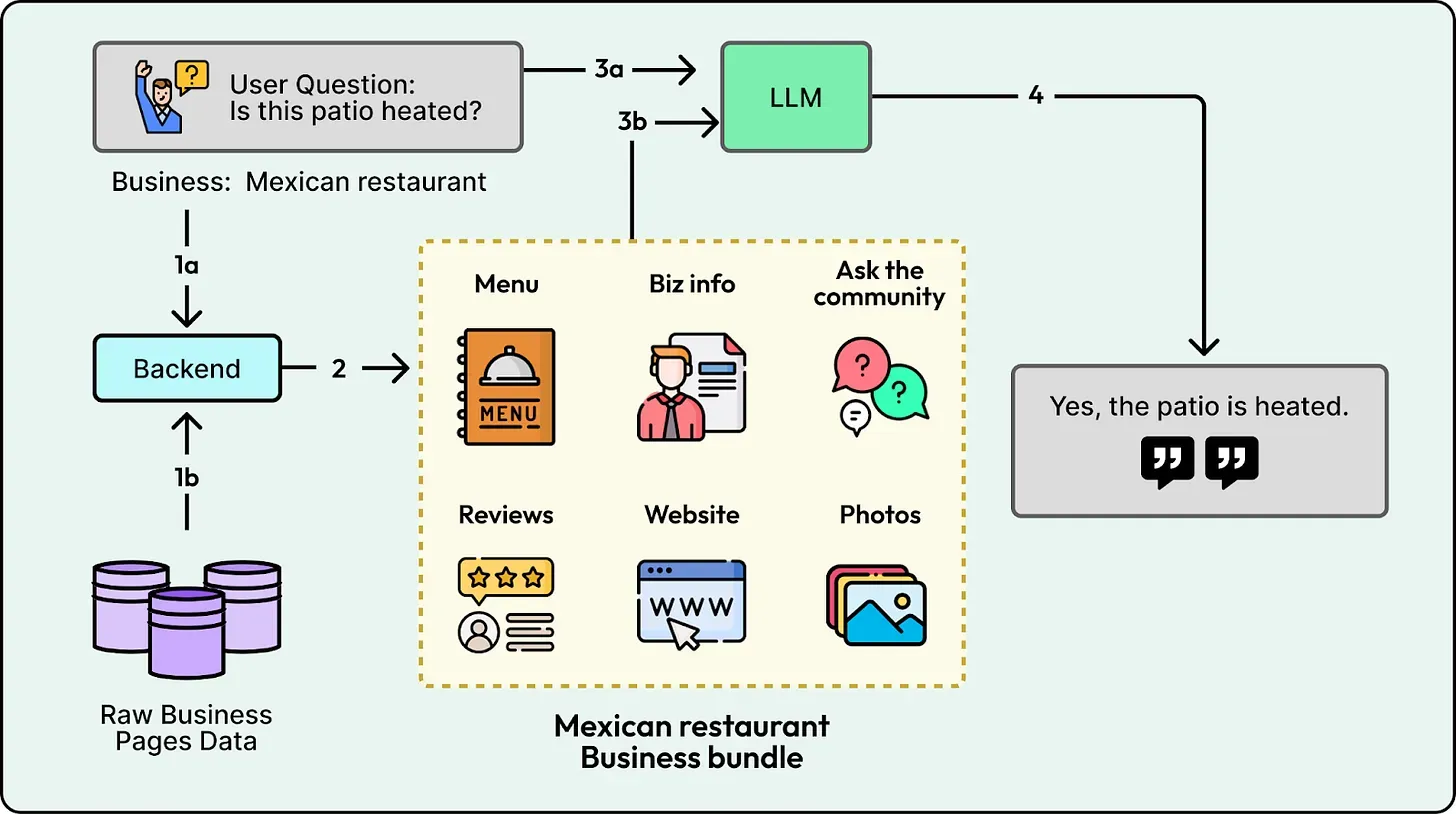 You open an app with one specific question in mind, but the answer is usually hidden in a sea of reviews, photos, and structured facts. Modern content platforms are information-rich, though surfacing direct answers can still be a challenge. A good example is Yelp business pages. Imagine you are deciding where to go and you ask “Is the patio heated?”. The page might contain the answer in a couple of reviews, a photo caption, or an attribute field, but you still have to scan multiple sections to piece it together.