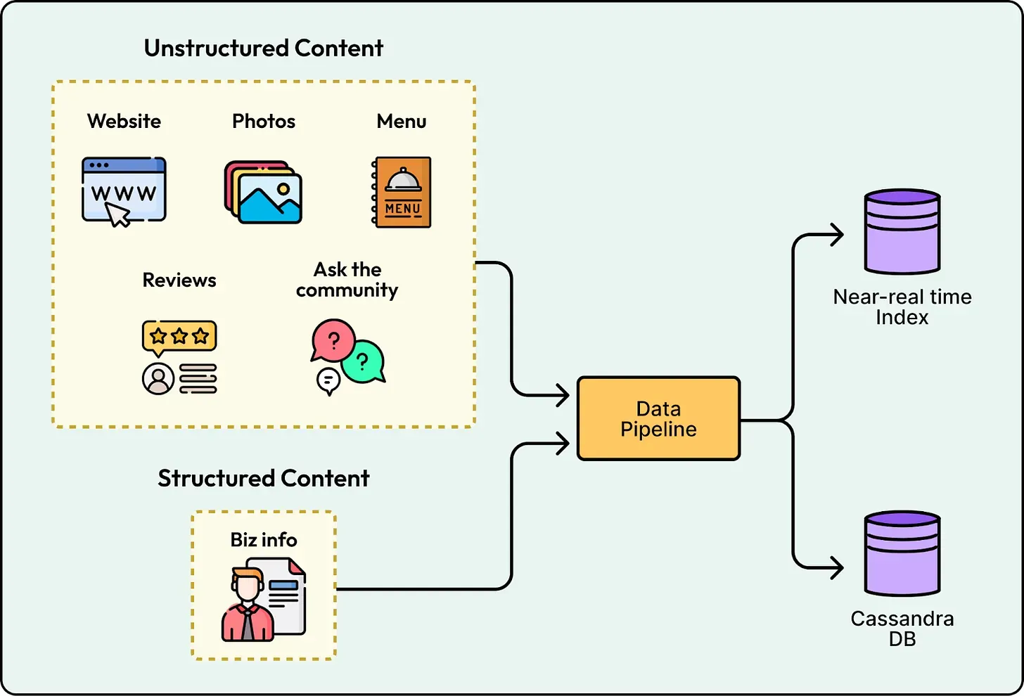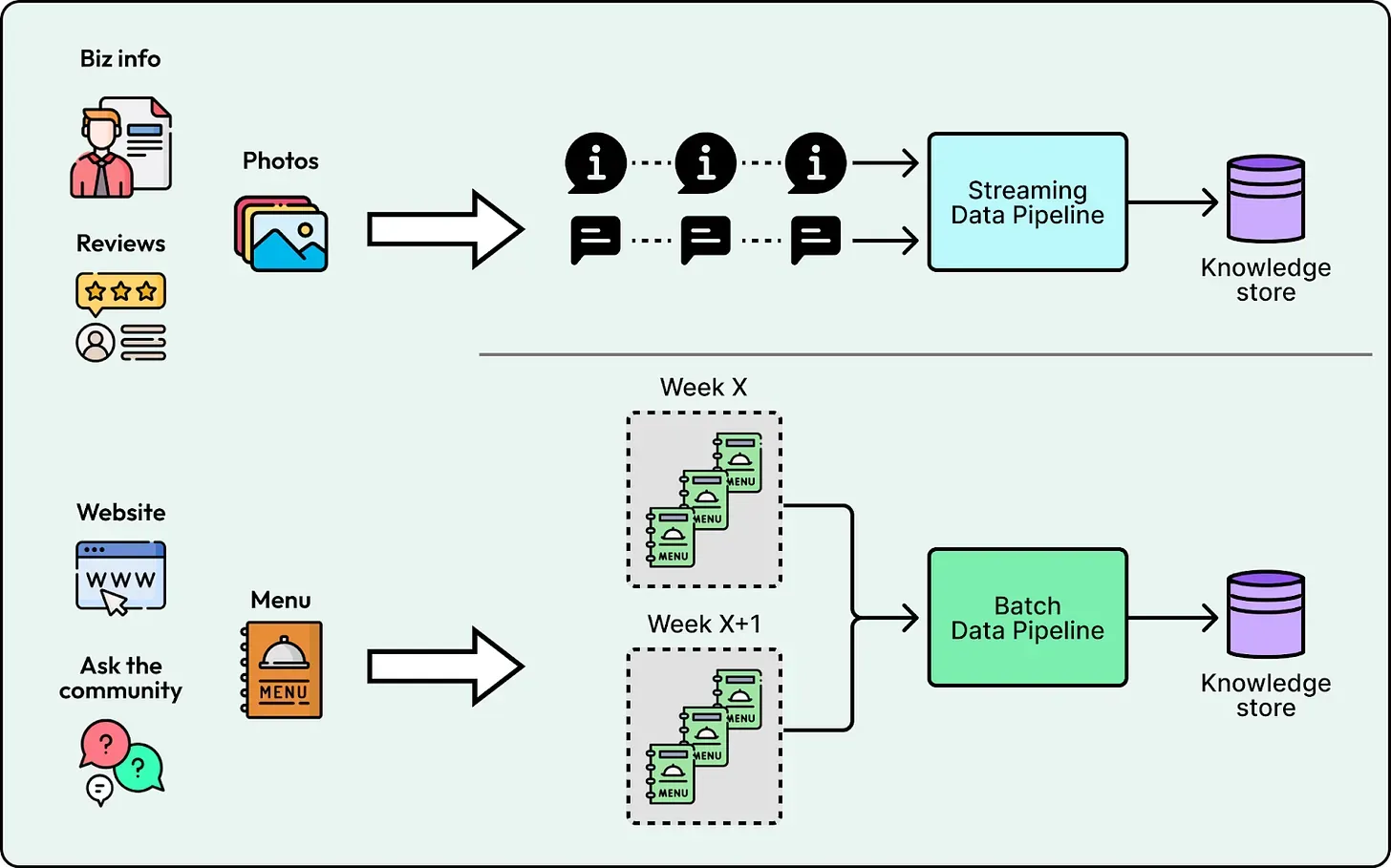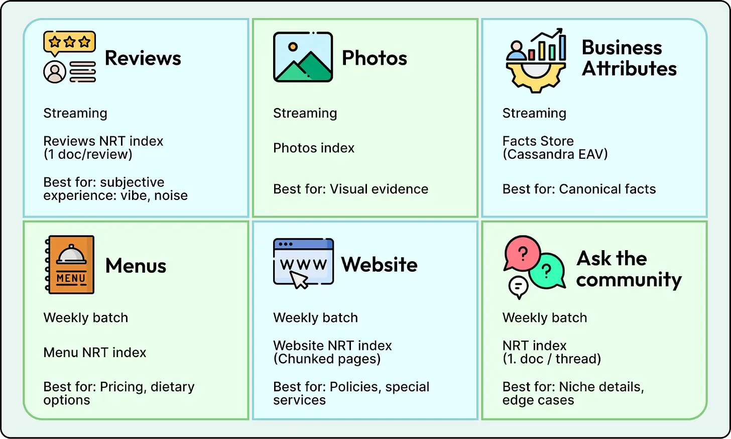 Section titled “1. Freshness”Treating every data source as real-time makes ingestion expensive to operate while treating everything as a weekly batch results in stale answers. Yelp set explicit freshness targets based on the content type. They implemented streaming ingestion for high-velocity data like reviews and business attributes to ensure updates appear within 10 minutes. Conversely, they used a weekly batch pipeline for slow-moving sources like menus and website text. This hybrid approach ensures a user asking “Is it open?” gets the latest status without wasting resources streaming static content.