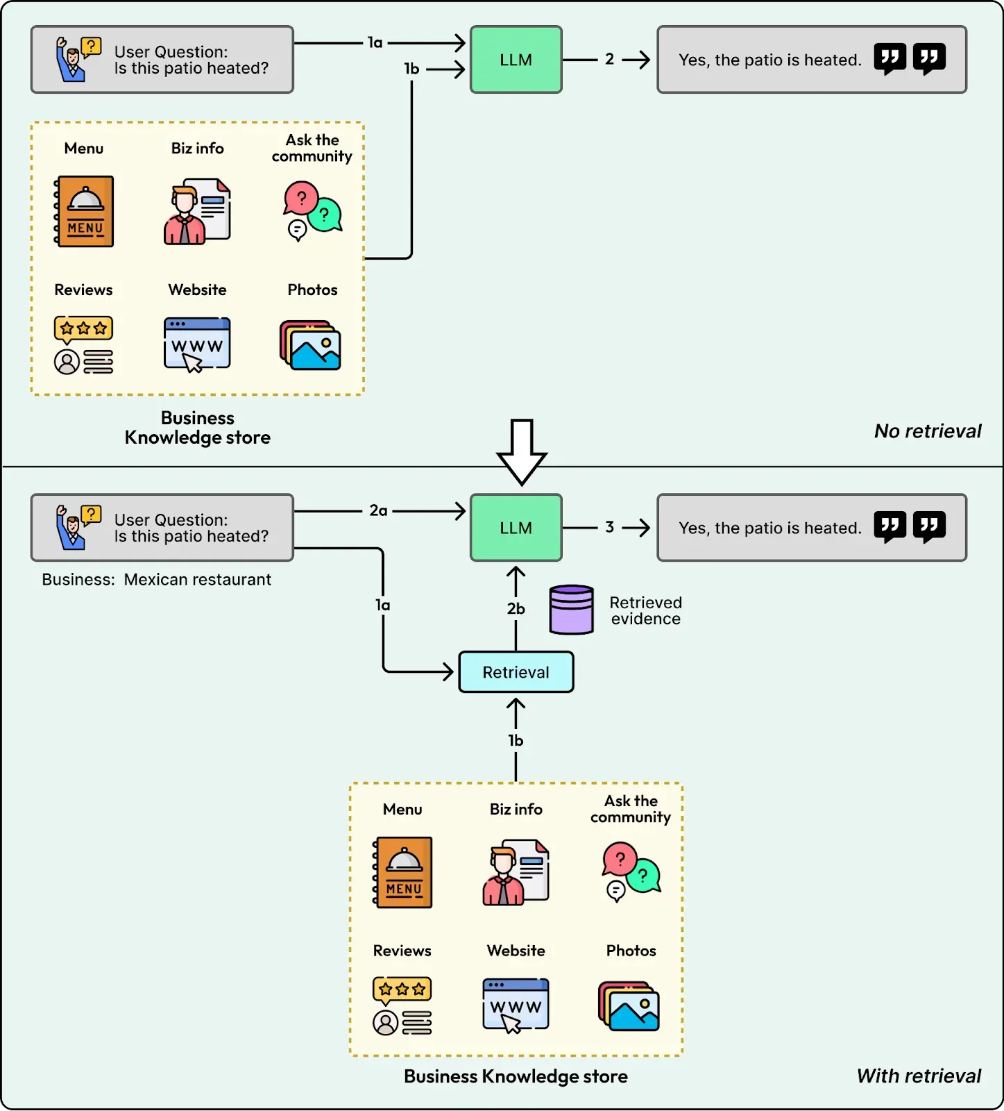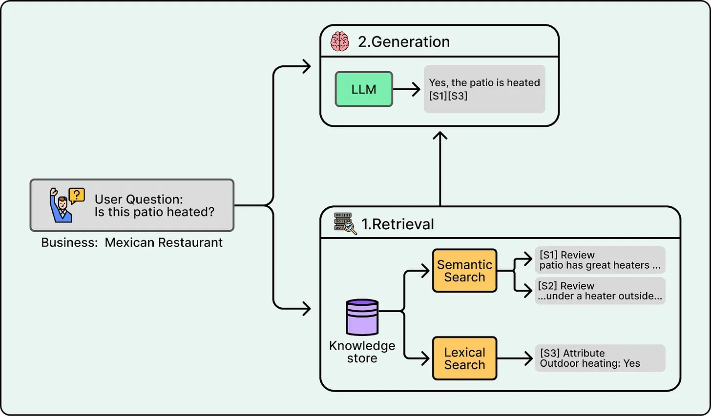 Section titled “1. Retrieval”Yelp separated “finding evidence” from “writing the answer.” Instead of sending the entire business bundle to the model, the system queries near real-time indices to retrieve only the relevant snippets. For a question like “Is the patio heated?”, the system retrieves specific reviews mentioning “heaters” and the outdoor seating attribute. The LLM then generates a concise response based solely on that evidence, citing its sources.