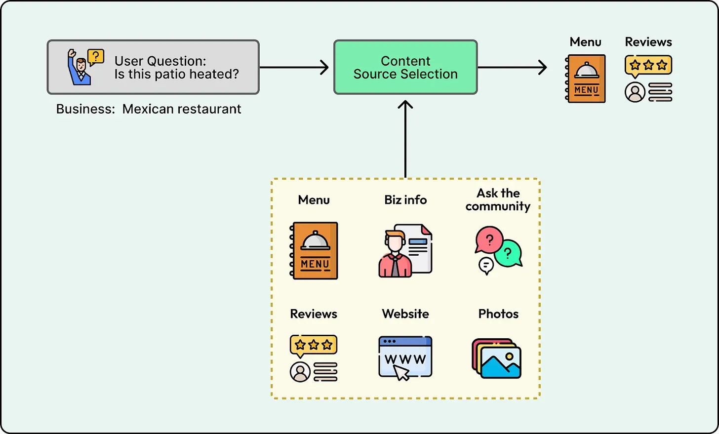 This routing also serves as conflict resolution if sources disagree. Yelp found it works best to default to authoritative sources like business attributes or website information for objective facts, and to rely on reviews for subjective, experience-based questions.