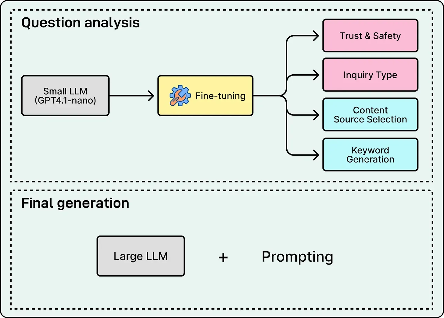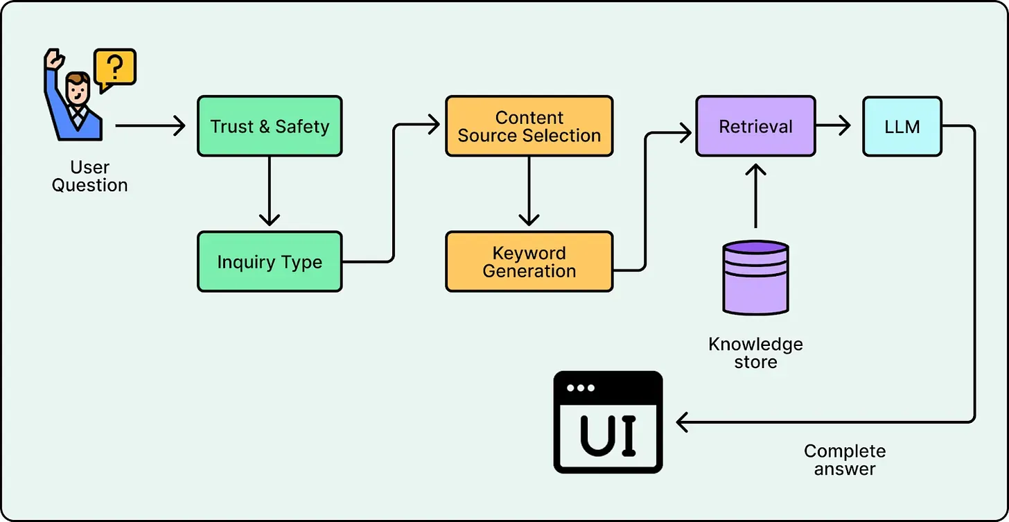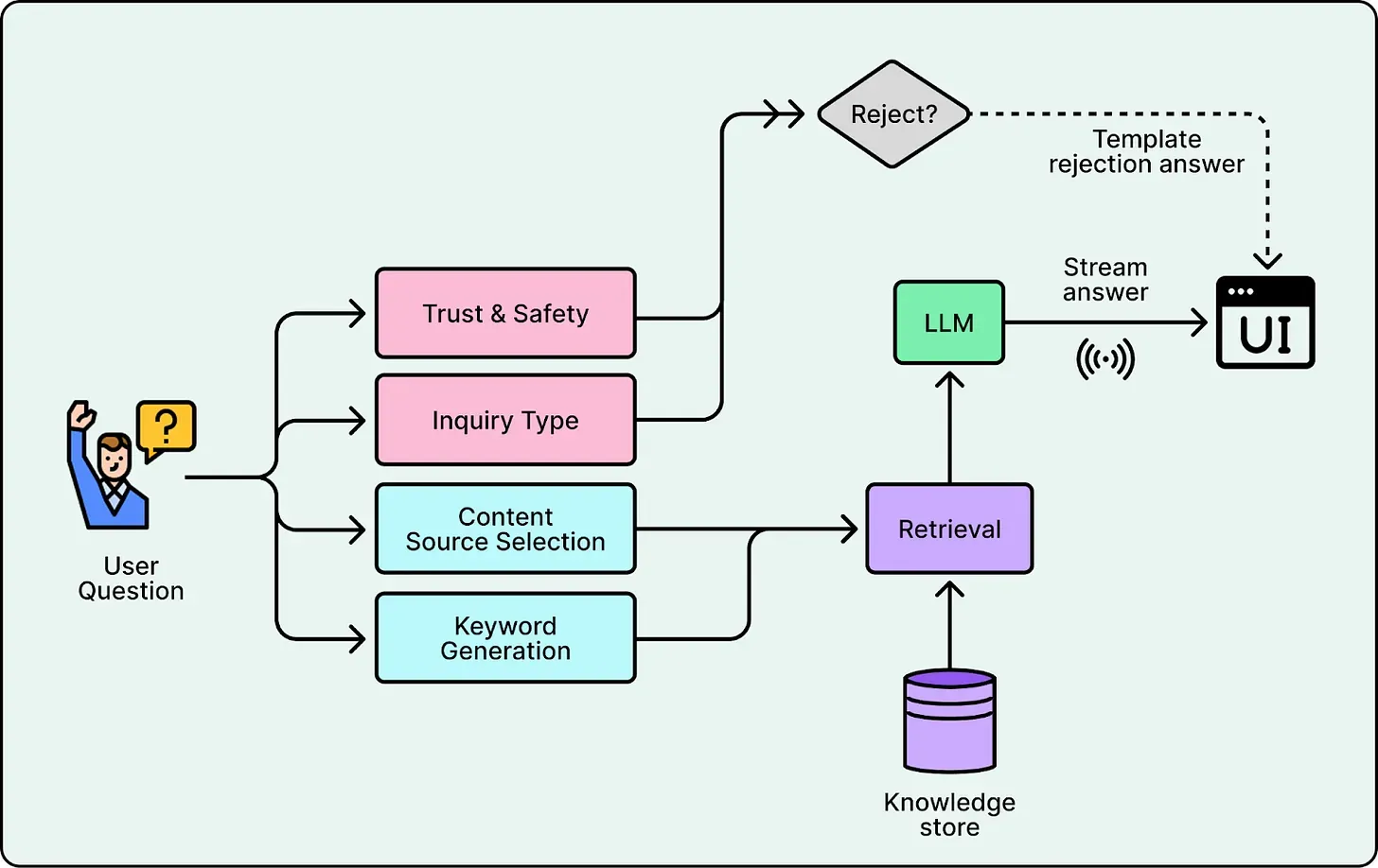 - Fine-tuning for question analysis: They fine-tuned small and efficient models (GPT-4.1-nano) for the question analysis steps including Trust and Safety, Inquiry Type, and Source Selection. These small models achieved lower latency and higher consistency than prompting a large generic model.