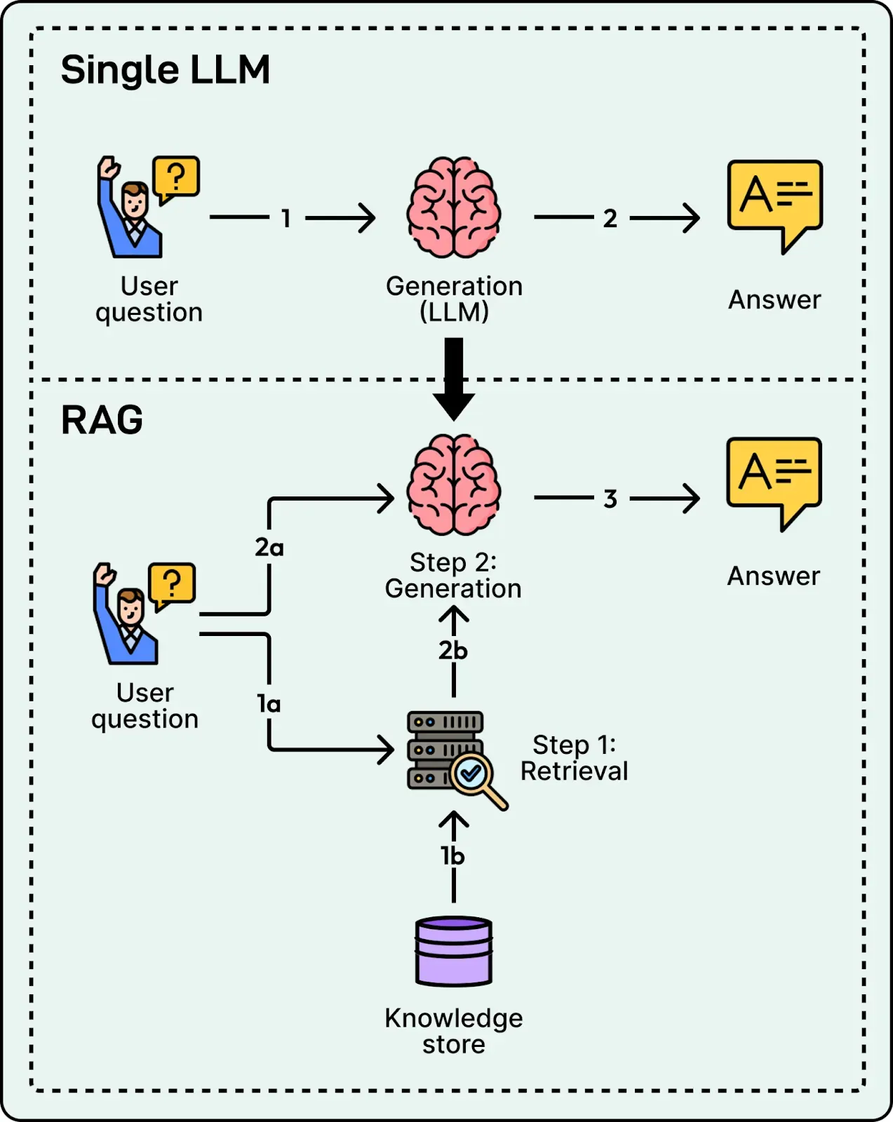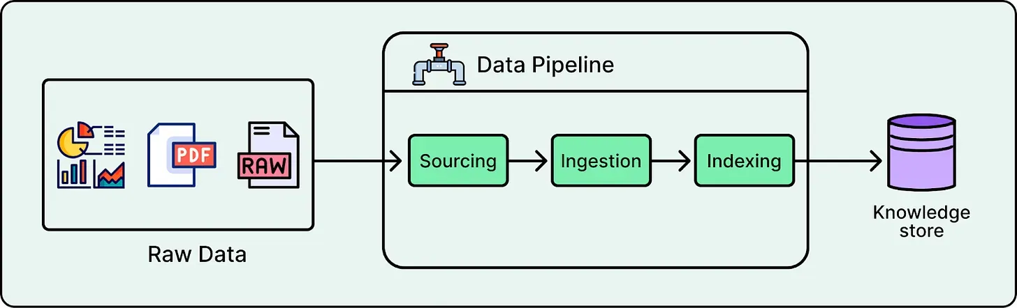 RAG decouples the problem into two distinct phases: retrieval and generation, supported by an offline indexing pipeline that prepares the knowledge store.