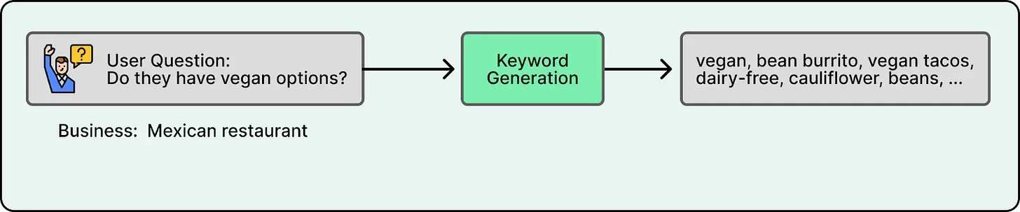 Yelp introduced a Keyword Generator, a fine-tuned GPT-4.1-nano model, that translates user queries into targeted search terms. For example, “vegan options” might generate keywords like “plant-based” or “dairy-free”. When the user’s prompt is broad, the Keyword Generator is trained to emit no keywords to avoid producing misleading keywords.