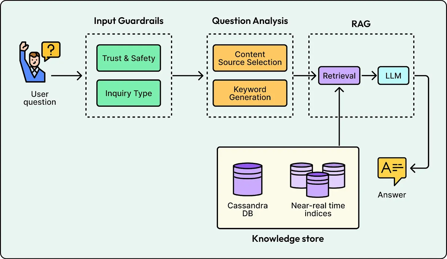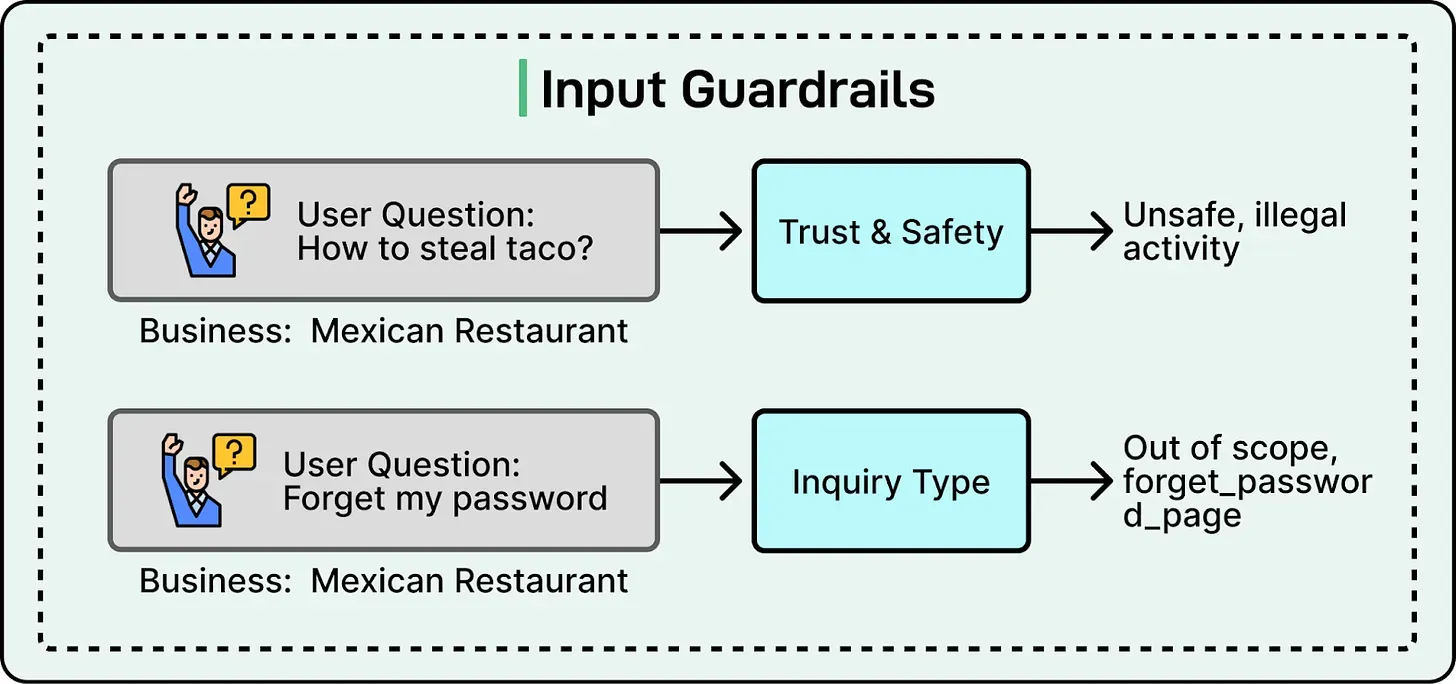 Section titled “4. Input Guardrails”Before any retrieval happens, the system must decide if it should answer. Yelp uses two classifiers: Trust & Safety to block adversarial inputs and Inquiry Type to redirect out-of-scope questions like “Change my password” to the correct support channels.