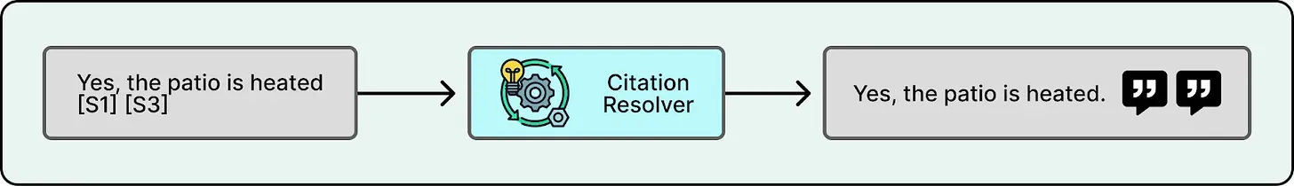 Citations are typically produced by having the model output citation markers that refer to specific snippets. For example, if the prompt includes snippets with IDs S1, S2, and S3, the model might generate “Yes, the patio is heated” and attach markers like [S1] and [S3]. A citation resolution step then maps those markers back to the original sources, such as a specific review excerpt, photo caption, or attribute field, and formats them for the UI. Finally, citations are verified to ensure every emitted citation maps to real retrievable content.