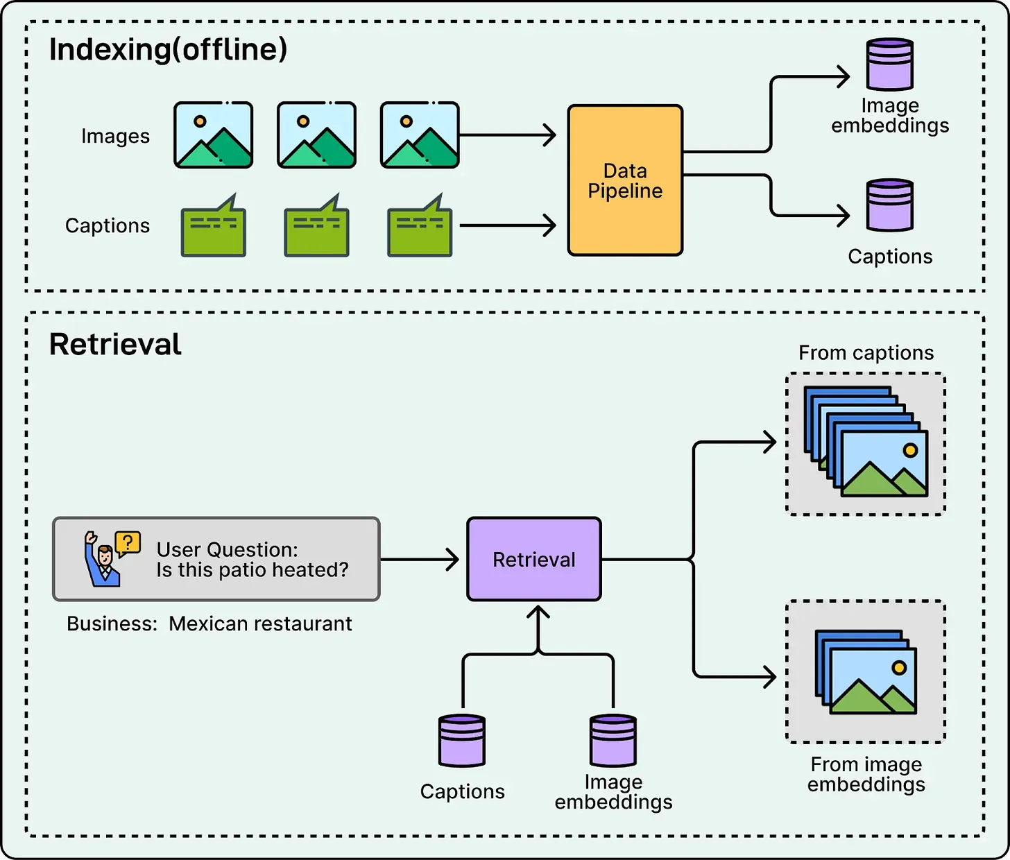 Yelp bridged this gap by implementing hybrid retrieval. The system ranks photos using both caption text matches and image embedding similarity. If a user asks about a heated patio, the system can retrieve relevant evidence whether the concept is explicitly written as “heaters” in the caption or simply visible as a heat lamp in the image itself.