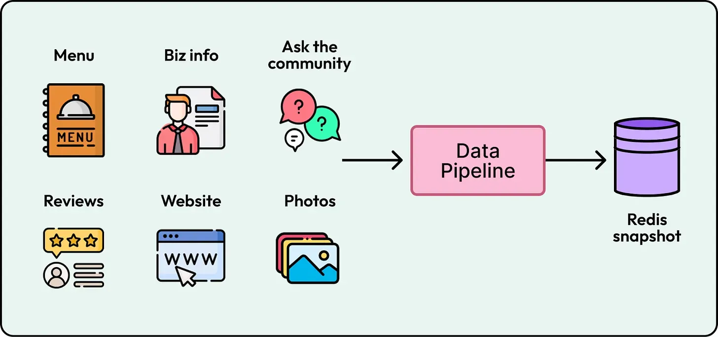 Yelp solved this by placing a Content Fetching API in front of all retrieval stores. This abstraction handles the complexity of parallelizing backend reads and enforcing latency budgets. The result is a consistent response format that keeps the 95th percentile latency under 100 milliseconds and decouples the assistant logic from the underlying storage details. The following figure summarizes the data sources and any special handling for each one.