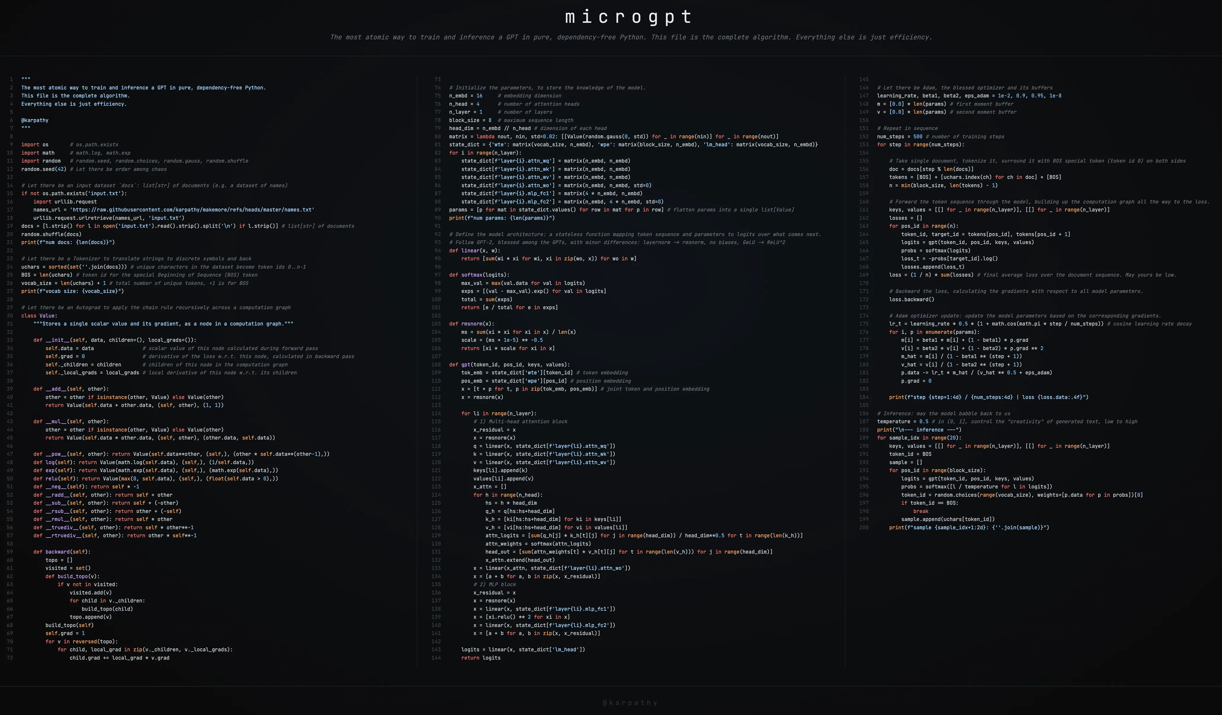 This is a brief guide to my new art project microgpt, a single file of 200 lines of pure Python with no dependencies that trains and inferences a GPT. This file contains the full algorithmic content of what is needed: dataset of documents, tokenizer, autograd engine, a GPT-2-like neural network architecture, the Adam optimizer, training loop, and inference loop. Everything else is just efficiency. I cannot simplify this any further. This script is the culmination of multiple projects (micrograd, makemore, nanogpt, etc.) and a decade-long obsession to simplify LLMs to their bare essentials, and I think it is beautiful 🥹. It even breaks perfectly across 3 columns: