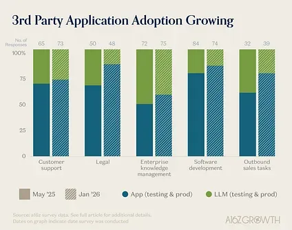 Section titled “Build v. Buy: Reports of the App Apocalypse Are Greatly Exaggerated”We also wanted to add insight into the age-old question: are enterprises building directly on models, or are they buying applications, instead?