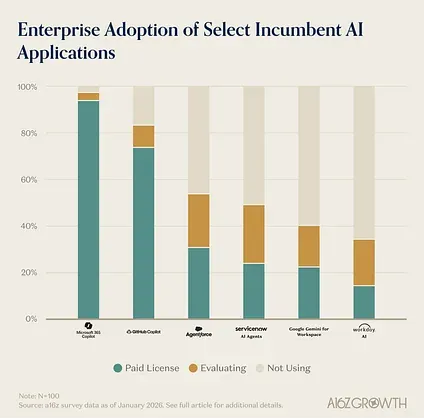 Microsoft still rules enterprise apps. With all the talk of OpenAI vs. Anthropic and Claude Code vs. Codex vs. Cursor, it’s important to keep in perspective that Microsoft continues to dominate the enterprise. Much of the Global 2000 AI adoption still runs through Microsoft or AI products launched by incumbents.