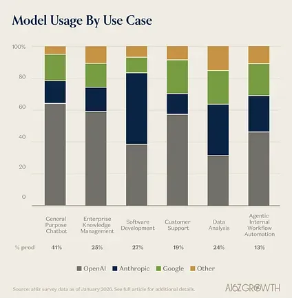 - OpenAI dominates early, horizontal use cases like general purpose chatbots, enterprise knowledge management and customer support. These were among the first AI workloads enterprises adopted–and incumbency matters.