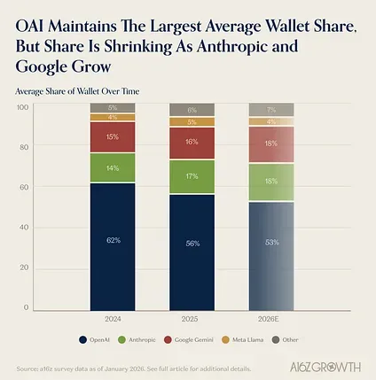 - Wallet share tells a similar story. OAI still commands a majority at ~56%, but Anthropic and Gemini are steadily gaining at OpenAI’s expense. The survey also suggests that respondents expect that shift to continue into 2026. Despite share shifts, all three model providers saw strong absolute spend growth.