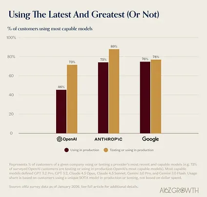- R&D is customer acquisition. Anthropic’s gains are driven by its most advanced models. 75% of Anthropic customers had Sonnet 4.5 or Opus 4.5 in production, far outpacing adoption of its older, cheaper models. OpenAI, by contrast, still sees significant usage of earlier model families–often because they were adopted early and continue to “work well enough.” Switching costs are rising, reinforcing the advantage of early enterprise footholds. 46% of OpenAI’s customers had GPT 5.2 or 5.2 Pro in production.