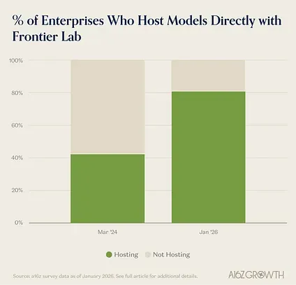 - As another signal of trust, ~80% of enterprises are comfortable hosting their models directly with enterprises vs. CSPs and other sources, up from ~40% in March 2024.