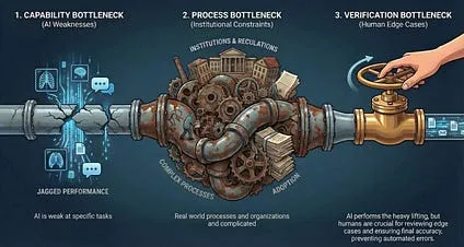 Section titled “Bottlenecks”And even small amounts of jaggedness can create issues that make super-smart AIs unable to automate a task. A system is only as functional as its worst components. We call these problems bottlenecks. Some bottlenecks are because the AI is stubbornly subhuman at some tasks. LLM vision systems aren’t good enough at reading medical imaging so they can’t yet replace doctors; LLMs are too helpful when they should push back so they can’t yet replace therapists; hallucinations persist even if they have become rarer which means they can’t yet do tasks where 100% accuracy is required; and so on. If the frontier continues to expand, some of these problems may disappear, but weaknesses are not the only form of bottleneck.