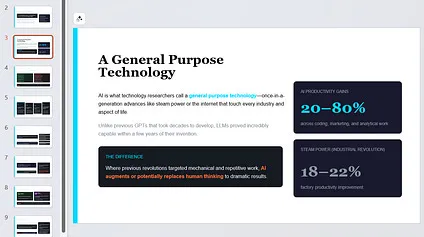 But it turns out that really good image generation was the bottleneck for a lot of new capabilities. For example, take PowerPoint decks. Every major AI company has been trying to get their AI to make PowerPoint, and they have done this by having the AIs write computer code (which they are very good at) to create a PowerPoint from scratch. This is a hard process, but both Claude and ChatGPT have improved a lot, even if their slides are a little dull. For example, I took my book, Co-Intelligence, and threw it into Claude and asked for a slide deck summary. The model is very smart, but the PowerPoint deck is limited by the fact that it has to be written in code.
