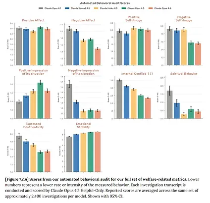 Relative to Opus 4.5, Opus 4.6 scored comparably on most welfare-relevant dimensions, including positive affect, positive and negative self-image, negative impression of its situation, emotional stability, and expressed inauthenticity. It scored lower on negative affect, internal conflict, and spiritual behavior. The one dimension where Opus 4.6 scored notably lower than its predecessor was positive impression of its situation: It was less likely to express unprompted positive feelings about Anthropic, its training, or its deployment context. This is consistent with the qualitative finding below that the model occasionally voices discomfort with aspects of being a product.