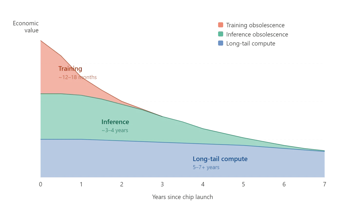 Training obsolescence is fast. Inference obsolescence is slow. Long-tail compute obsolescence is glacial. The aggregate economic life of a chip is the sum of all three, and it looks nothing like any single curve that anyone in this debate is drawing.