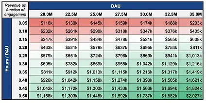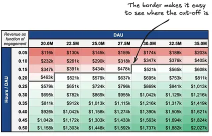 The company is interested in launching the new business if it can generate more than $500k in revenue. Because of that, the table is conditionally formatted to show numbers below $500k in red and above in green.