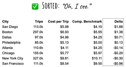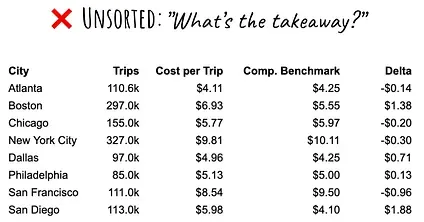 By simply sorting the table by the most important metric (for the point you’re trying to make), you make the data much easier to understand.