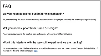 But: You can prevent that from happening if you anticipate the most likely questions and concerns your stakeholders will have and address them in an FAQ section: