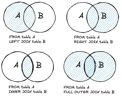 As a reminder, here are the most common join types; the blue area represents the records that will be kept after joining two tables A and B: