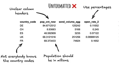 - Make sure the data is readable by humans (i.e. no weird acronyms and column names)