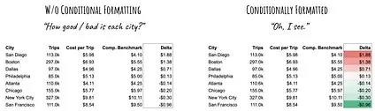 Section titled “Conditional Formatting”While the sorted table is better, it still has a major problem: It takes some effort to really interpret the deltas in the last column.