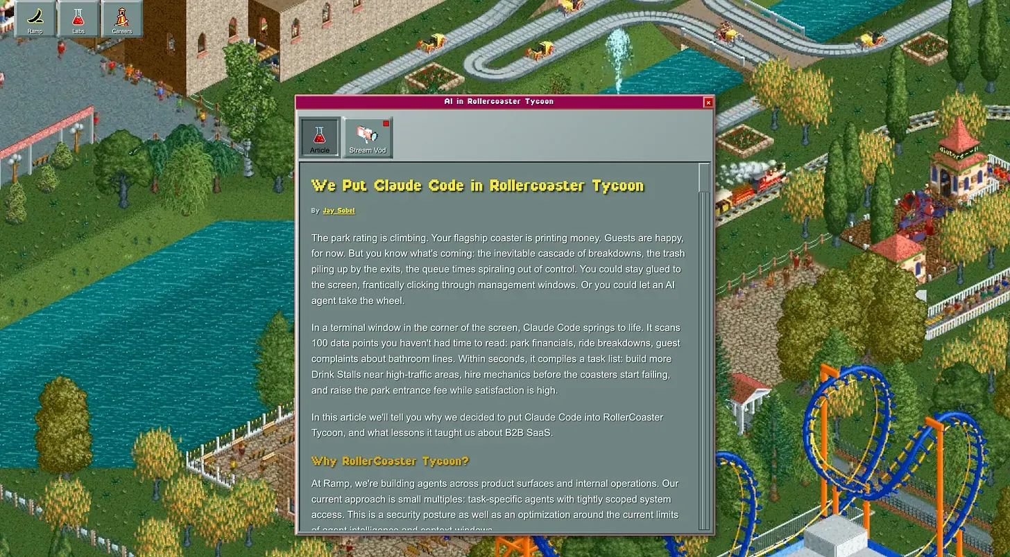 Ramp Labs is a particularly useful example. Look at the diversity of experiments that Ramp is running, everything from Excel experiments to RollerCoaster Tycoon. The benefit is twofold: