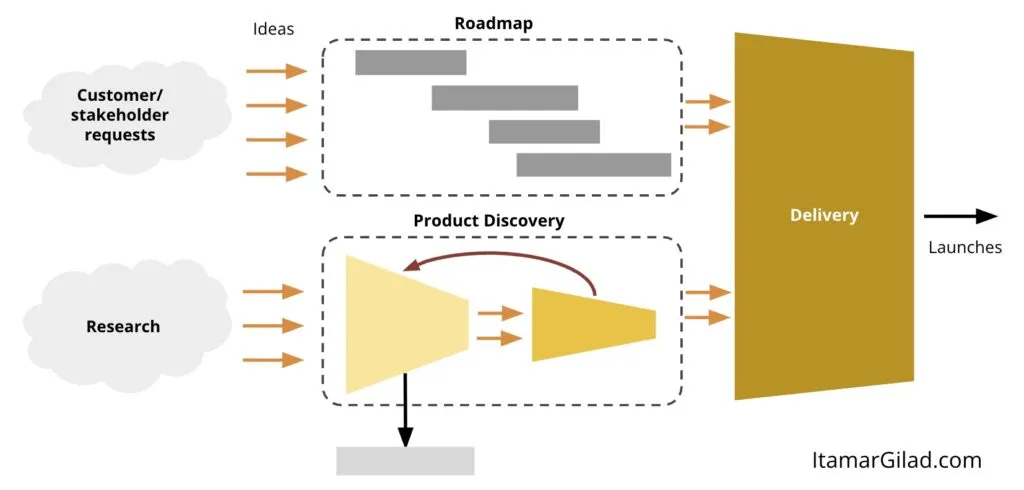 This hybrid system deeply undermines product discovery. Given the option, managers and business stakeholders will position their ideas as must-haves to get them fast-tracked. As the priority from above will always be on shipping the “must-haves” the product discovery track is starved of time, resources, and focus. The company becomes far less innovative, and the product org is left understandably confused and frustrated.