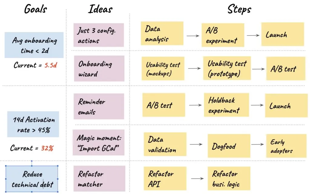 Section titled “2. Bad/Weak Goals”The product discovery process is geared towards achieving clear, measurable outcomes (sometimes paraphrased as “problems to solve”), but in many companies teams lack such goals.. The company has top-level business goals for revenue, profit, market share and so on, and there may be disciplinary goals — engineering, product, marketing, design — and departmental goals, but those don’t help teams figure out what they need to achieve. The goal void is filled with plans and roadmaps. The implicit goal of most product teams is to follow the plan.