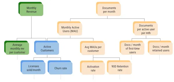 A common approach is to start with a multi-level business model that outlines the most important metrics for the business and for the users. There are multiple ways to create such models including user journeys, flywheels, and canvases. One model that I find broadly applicable is dual metrics trees: you start by identifying the two top-level metrics of the company — the top business metric, and the north star metric (measuring user value) — and then building metrics trees supporting each, which invariably overlap.