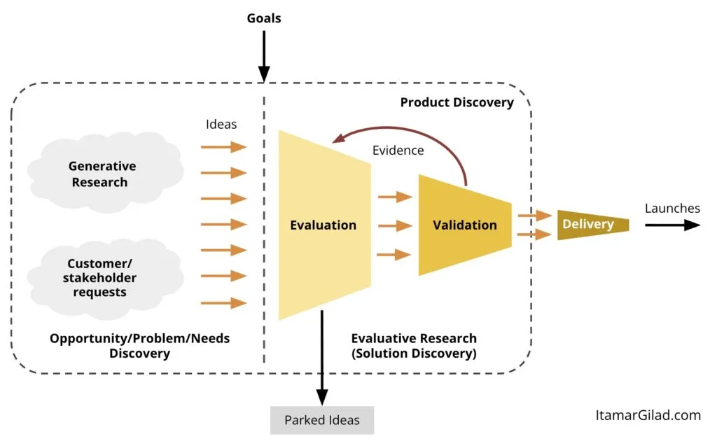 - Solution discovery (aka evaluative research — Determining which ideas are worth developing. This includes two sub-activities: evaluation (aka prioritization) and validation (aka experimentation), that are connected by a feedback loop of learning. The evidence collected in a validation step helps us to re-evaluate the idea and make informed decisions.