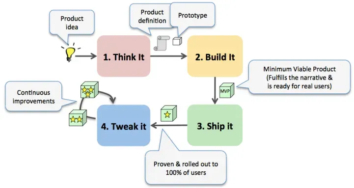 I still like Think It → Build It → Ship It → Tweak It. Use an initial discovery team to produce a prototype and product definition; expand to a build team to produce the first MVP release to real users; progressively roll out to all users; continuously improving the product until the next round of discovery or exit.