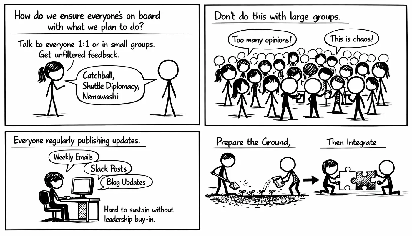 - Talk to everyone in 1:1s or small groups to get their unfiltered feedback on the plan. This is also known as catchball, shuttle diplomacy, or nemawashi. Don’t try this with large groups unless you want to avoid getting actual feedback.