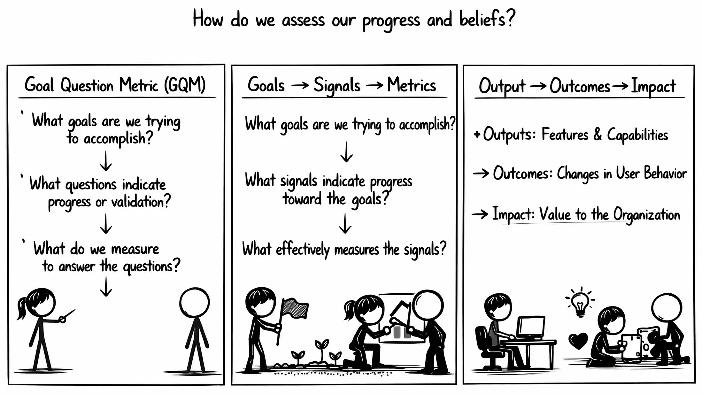 - Goals Signals Metrics. What goals are we trying to accomplish? What signals indicates progress toward the goals? What effectively measures the signals?