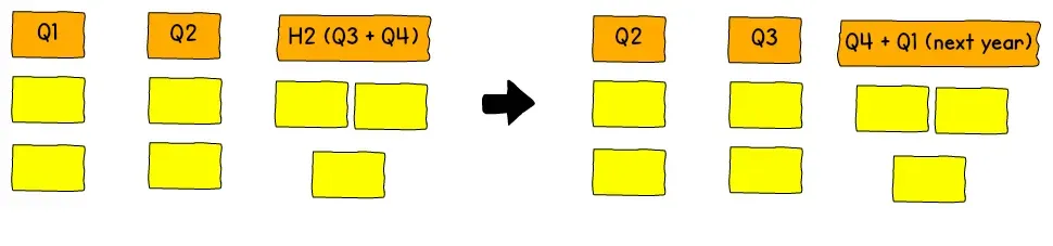 Section titled “Rolling Wave: Current Quarter, Current +1, Current +2 and +3”Adding a rough timeline is the next step above Now Next Later.