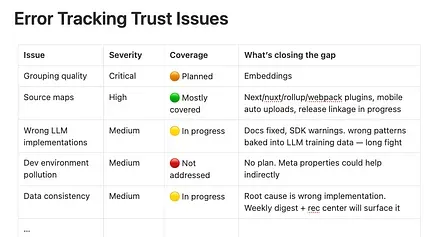 - The context: A series of customer interviews all pointed to the same theme: trust. Users were leaving because of rough edges, such as missing recordings or unhandled stack trace edge cases.