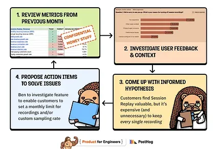 Product managers at PostHog track and ensure success 3 by running growth reviews: monthly meetings where they go over revenue trends, user feedback, usage metrics, and quarterly goals with the engineers building the product.