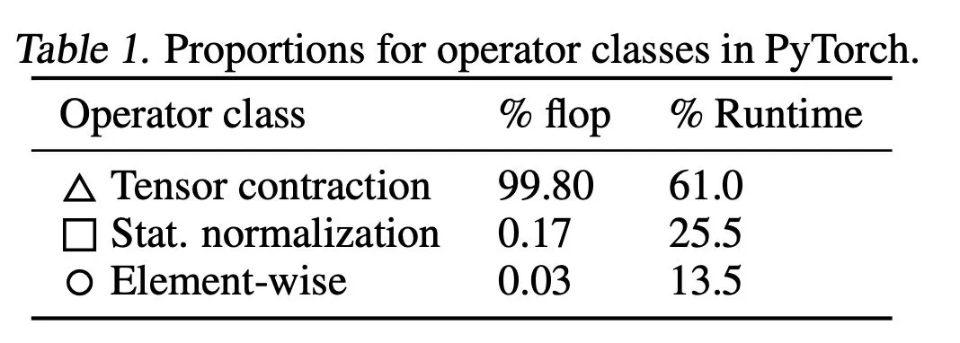 The fact that GPUs are so much slower at everything that isn’t a matrix multiply might seem problematic at first - what about our other operators like layer norm or activation functions? Well, the truth is, those operators are just rounding errors in terms of FLOPS. For example, let’s look at this table of FLOP counts on BERT for different operator types from this paper, where “Tensor Contraction” = matmuls.