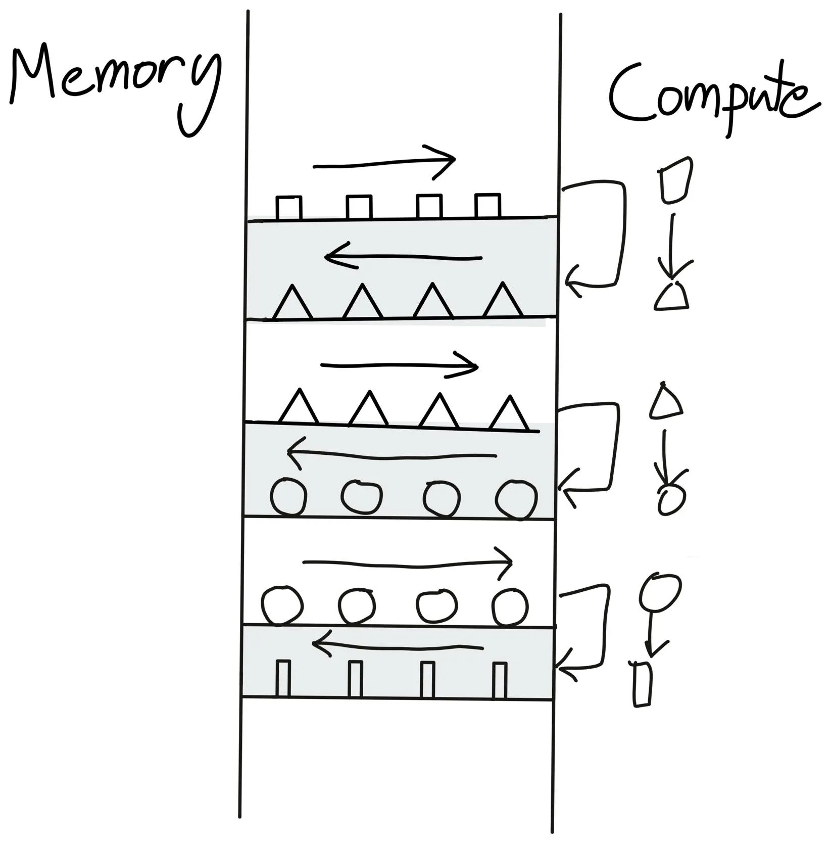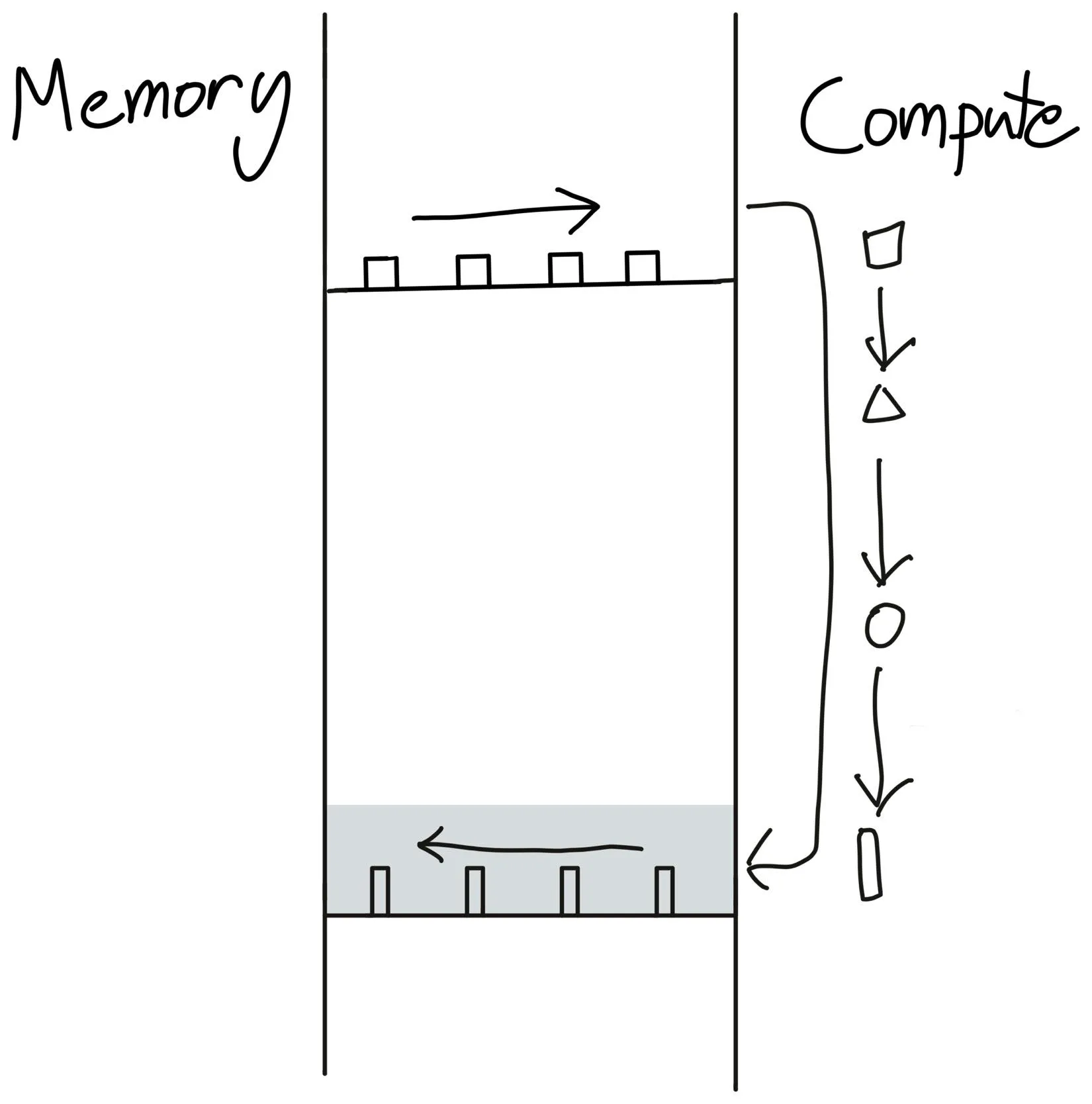 Hey! This is a very stupid arrangement. Why are we sending the same data to global memory and then back to the compute units, over and over? We should just keep the data at the factory, perform all of our compute, and then send it back!