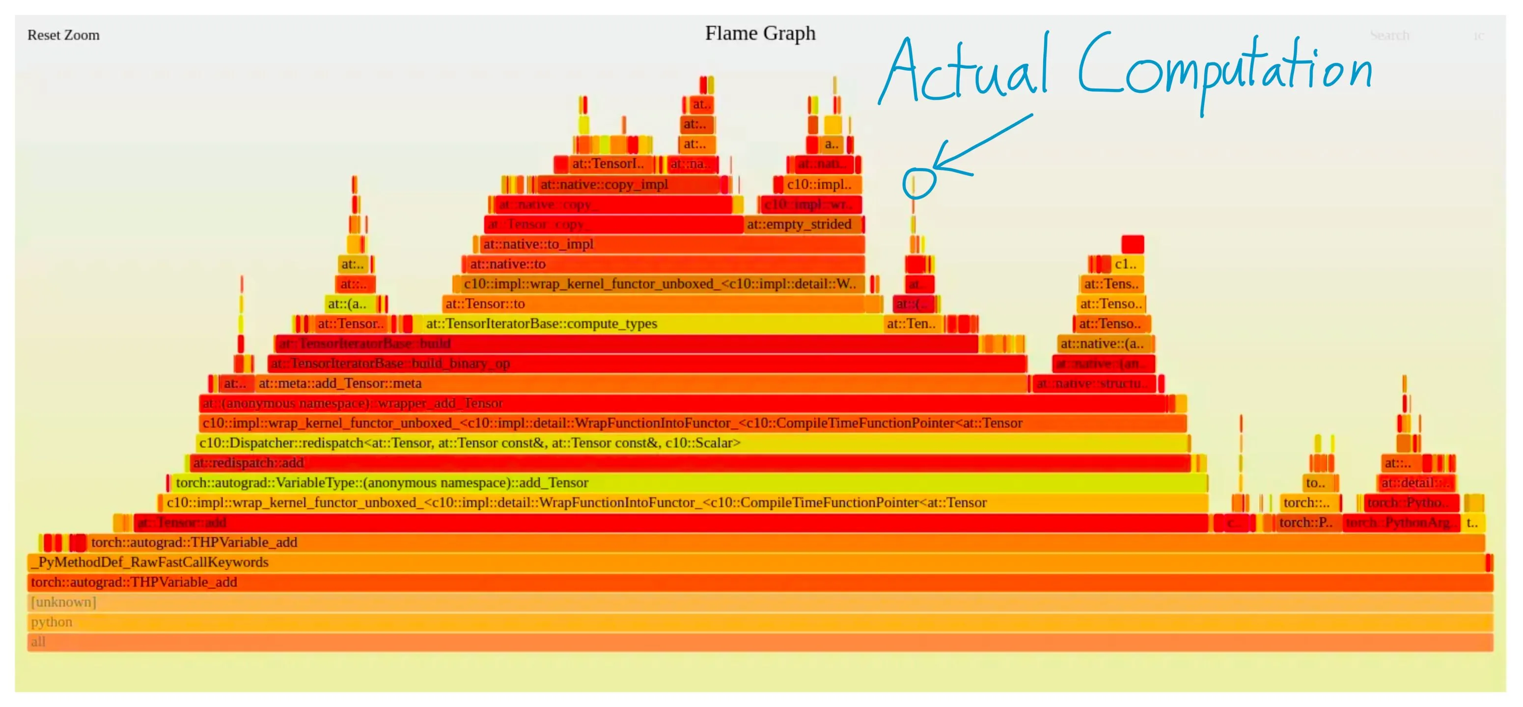 For example, look at this flamegraph profile of PyTorch performing a single addition. That box right there? That’s what’s performing the actual computation. Everything else is pure overhead.