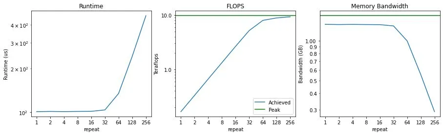 def f(x: Tensor[N]): for _ in range(repeat): x = x * 2 return xand benchmark it with a fusing compiler, we can then calculate the FLOPS and memory bandwidth achieved for various values of repeat. Increasing repeat is an easy way of increasing our amount of compute without increasing our memory accesses - this is also known as increasing compute intensity.