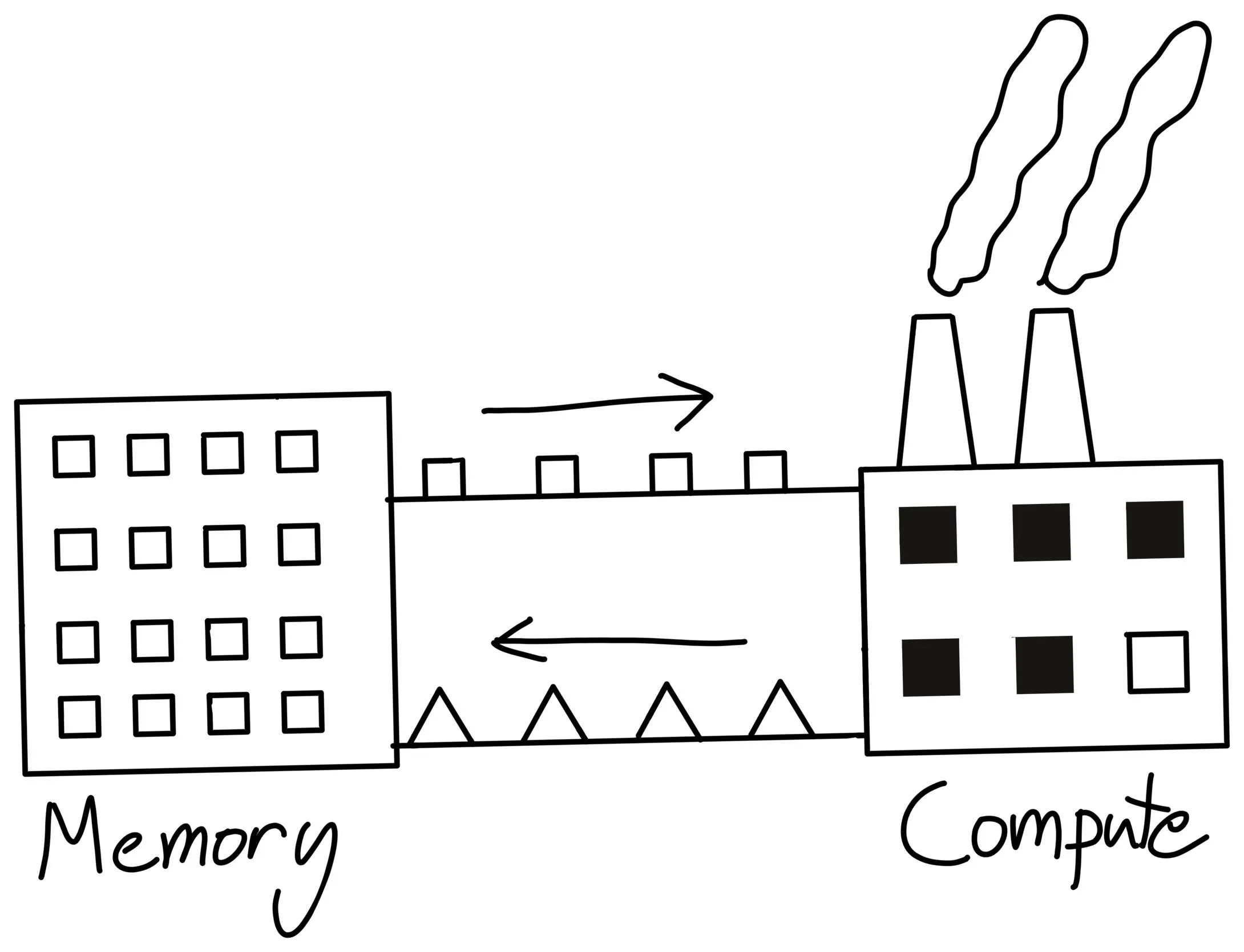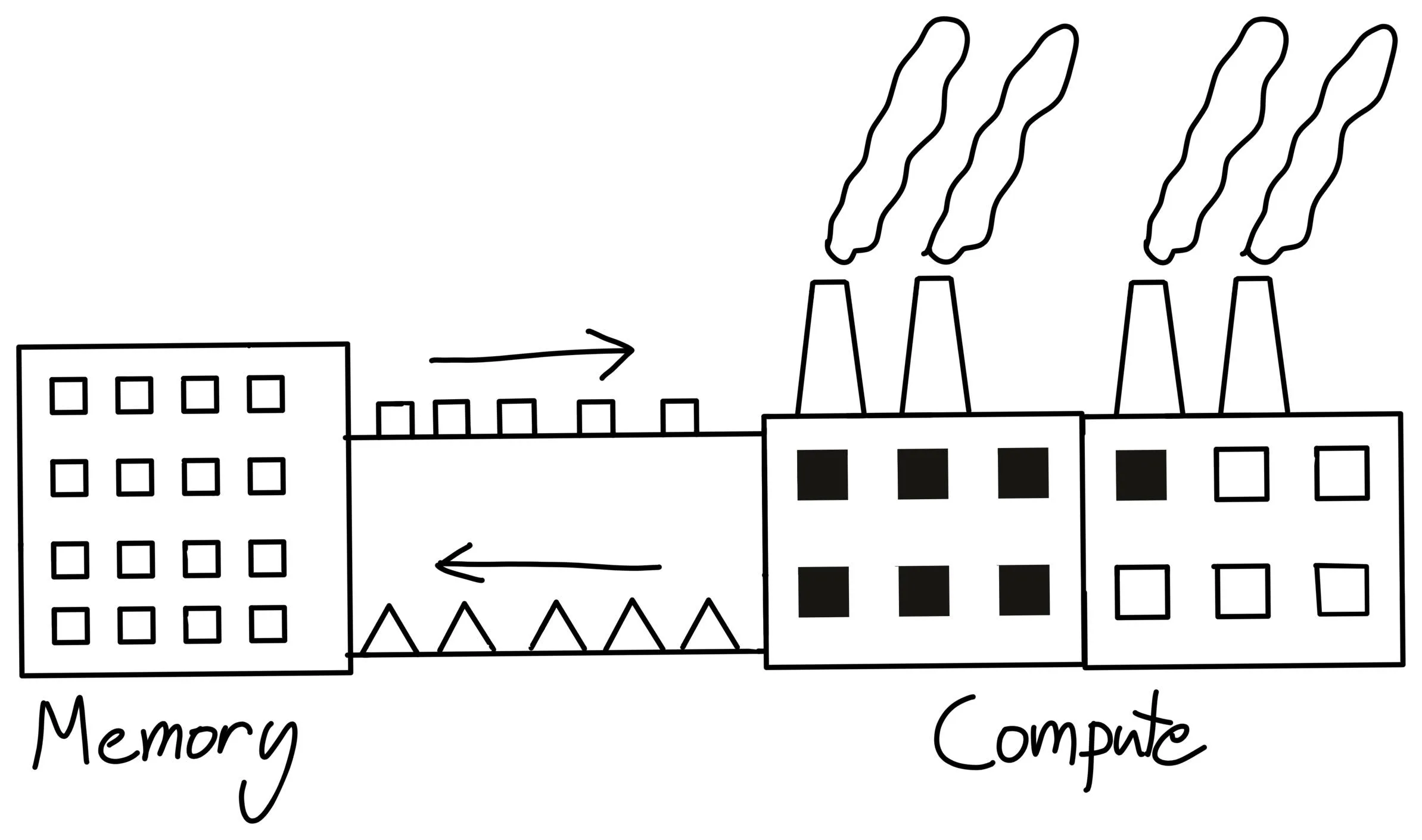 One way to think about compute is as a factory. We send instructions to our factory (overhead), send it materials (memory-bandwidth), all to keep our factory running efficiently (compute).
