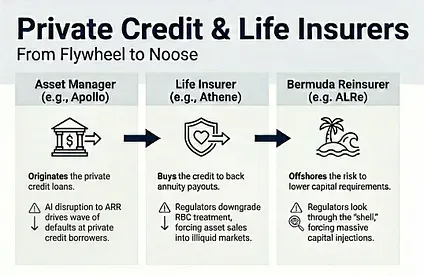 Over the prior decade, the large alternative asset managers had acquired life insurance companies and turned them into funding vehicles. Apollo bought Athene. Brookfield bought American Equity. KKR took Global Atlantic. The logic was elegant: annuity deposits provided a stable, long-duration liability base. The managers invested those deposits into the private credit they originated and got paid twice, earning spread over on the insurance side and management fees on the asset management side. A fee-on-fee perpetual motion machine that worked beautifully under one condition.