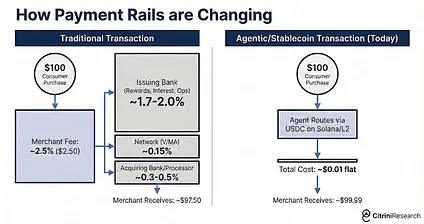 Agentic commerce routing around interchange posed a far greater risk to card-focused banks and mono-line issuers, who collected the majority of that 2-3% fee and had built entire business segments around rewards programs funded by the merchant subsidy.