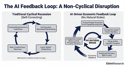 AI capabilities improved, companies needed fewer workers, white collar layoffs increased, displaced workers spent less, margin pressure pushed firms to invest more in AI, AI capabilities improved…